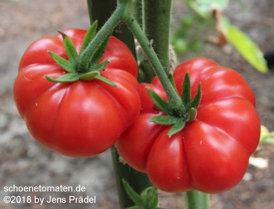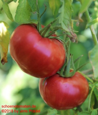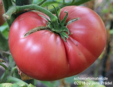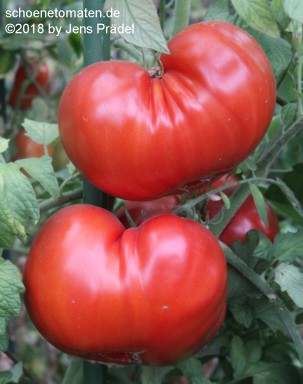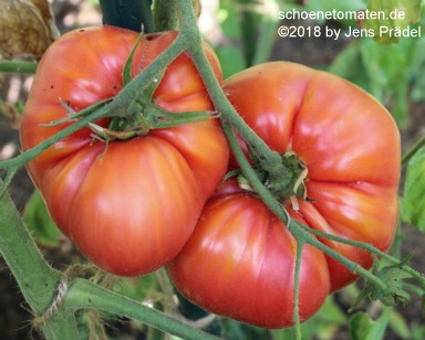 große (ø 7 bis 9 cm, ca. 7 cm hoch), tendenziell herzförmige, aber auch breitrunde, dunkel pinkrote Früchte
