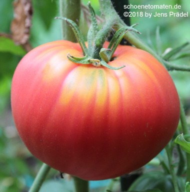 große bis sehr große (ø 7 bis 11 cm und 5,5 bis 6 cm hoch), breitrunde, glatte, warmrote Früchte