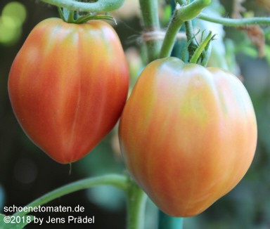 mittelgroße bis große (ø 5 bis 9 cm, 8 bis 10 cm hoch), breitrunde, herzförmige, orangerote Früchte mit orangefarbener Kappe und stumpfer Spitze