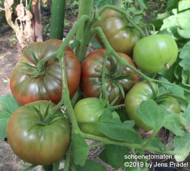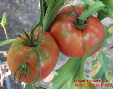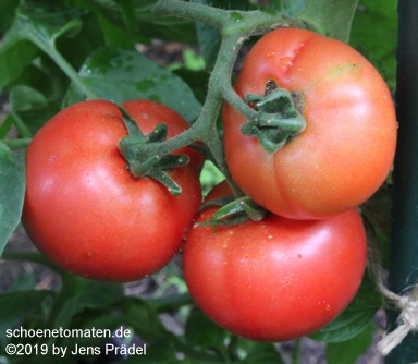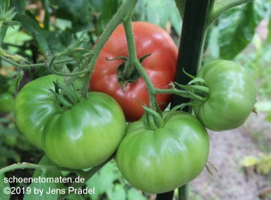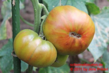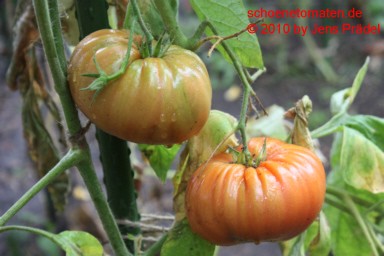kleinere Pflanzen (1,5 m) sehr später Erntebeginn (Mitte September) dadurch geringer Ertrag relativ kleine, breitrunde und ziemlich gleichmäßig im Kragenbereich gerippte, rote Früchte größte geerntete Frucht: 165 g schöner, süßlicher Geschmack, fleischig In besseren Tomatenjahren ist eine frühere Ernte von Früchten um 500 Gramm zu erwarten. |
