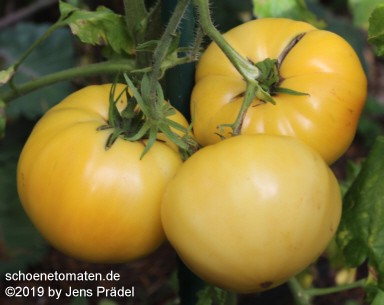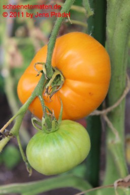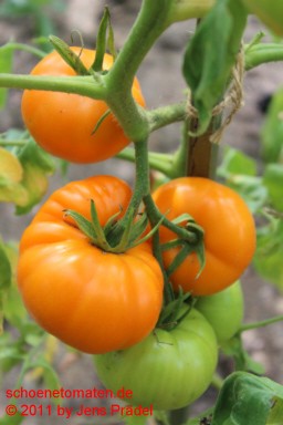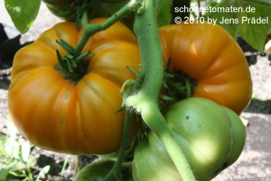 mittelgroße, kartoffelblättrige Pflanzen (1,5 bis 1,8 m) später Erntebeginn (Ende August) mittlerer Ertrag große bis sehr große (ø 8 bis 11 cm, 6 bis 7 cm hoch), einheitlich breitrunde, etwas unregelmäßig gerippte, orangefarbene Früchte größte geerntete Frucht: 486 g (2010), 431 g (2019) schöner, fruchtiger Tomatengeschmack, wie Obst |