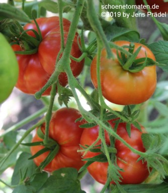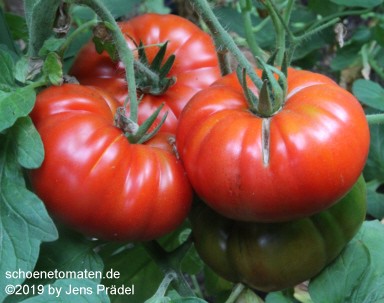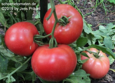 mittelgroße (bis 2 m) Pflanzen später Erntebeginn (Ende August) sehr ertragreich große bis sehr große (ø 10 bis 13 cm), breitrunde, unregelmäßig gerippte, teilweise auch herzförmige, hellrote bis rosafarbene Früchte schwerste geerntete Frucht: 365 g (2010), 589 g (2019) schöner, würziger Geschmack Prima Sorte! |