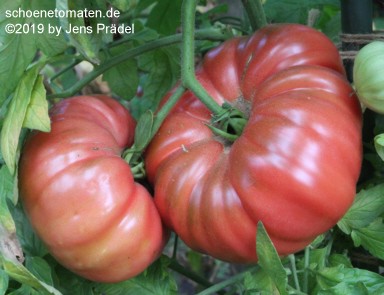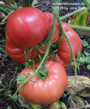 große Pflanze (1,8 bis 2,2 m) später Erntebeginn (Ende August) trotzdem sehr reicher Ertrag von durchweg gigantischen Früchten sehr große, breitrunde, leicht gerippte oder gedellte (da nicht zu saftig), rosarote Früchte größte geerntete Frucht: 685 g (2012), 671 g (2019) kräftiges Tomatenaroma, sehr fleischig Eine empfehlenswerte Sorte für Liebhaber von Riesenfleischtomaten! |