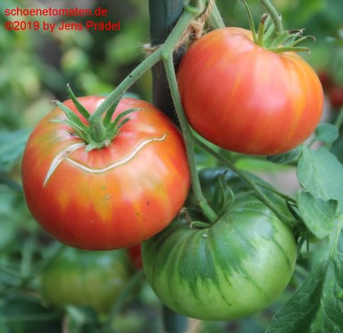große Pflanzen (1,9 bis 2,1 m) 2012: sehr später Erntebeginn (Anfang September) 2019: mittelfrüher Erntebeginn (Mitte August) guter Ertrag mittelgroße bis große (ø 9 bis 11 cm, 6 bis 7 cm hoch), breitrunde, oft etwas unförmige, gerippte, unregelmäßig orange-rot gefleckte Früchte auch aufgeschnitten wunderschön rot-orange-gelb marmoriert Früchte enthalten nur wenige Samen. größte geerntete Frucht: 387 g (2012), 405 g (2019) Schmeckt wie Obst: süß, saftig und fruchtig! Eine wunderschöne und ausgezeichnet schmeckende Fleischtomate! |