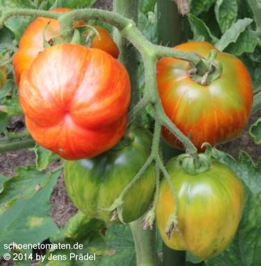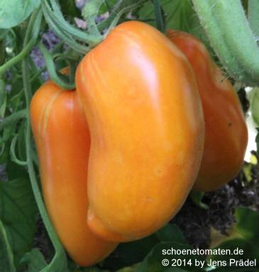 mittelgroße (ø ca. 5 cm bis 6 cm, 4,5 bis 5 cm hoch), dick zapfenförmige oder blockpaprikaförmige, etwas gekerbte, rote Früchte mit orangefarbenen Streifen besonders im unteren Fruchtteil