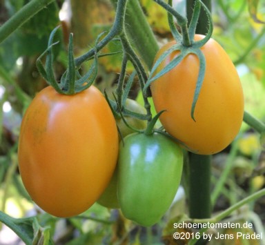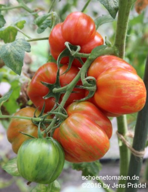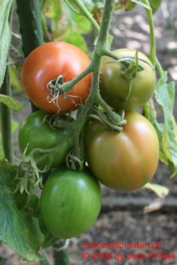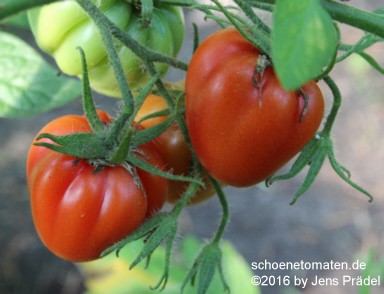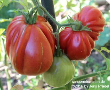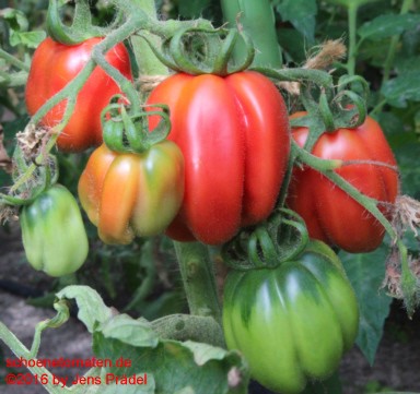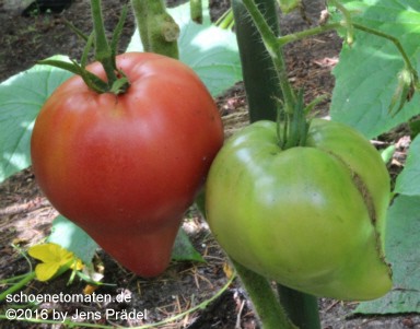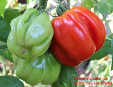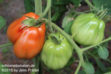 Nach Gerhard Bohl vom SamenArchiv hat diese Sorte eine "wulstig herzförmige" Fruchtform. "Teilweise spaltet sich die Sorte in wuchtig keilförmige und in große runde Formen auf." Ich habe offensichtlich die keilförmige Form erwischt. |