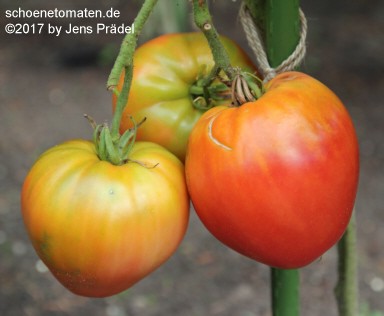 mittelgroße bis große (ø 7 bis 9 cm), herzförmige, pinkrote Früchte mit orangefarbenem Kragen