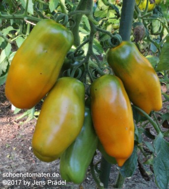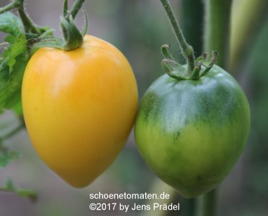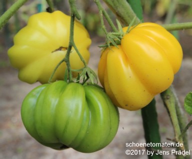 mittelgroße bis große (ø 5 bis 8 cm), herzförmige, gelbe Früchte mit angedeuteter, stumpfer Spitze