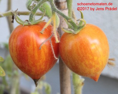 kleine (ø ca. 4 cm, 4 bis 4,5 cm lang), leicht hochrunde, rote Früchte mit orangefarbenen Streifen und einer ausgeprägten stumpfen Spitze