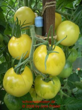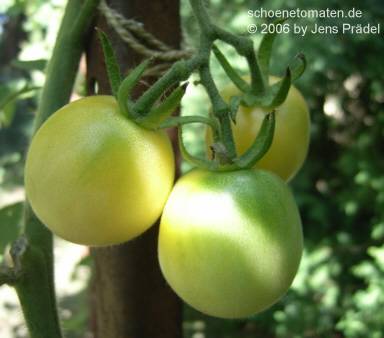 kleine bis mittelgroße (50 bis 80 g bei ca. ø 4-5 cm), runde,etwas kantige, hellgelbe, grünschultrige (verblasst aber bei Reife) Früchte