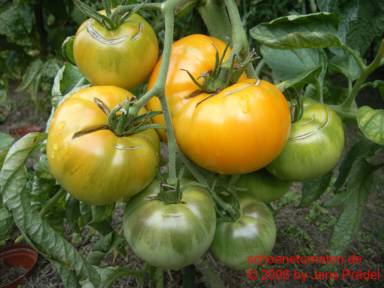 Die Früchte einer zweiten Pflanze waren größer und hatten unterschiedliche Formen: neben runden auch hochrunde ovale, sowie teilweise sogar plattrunde dunkelgelbe Früchte.