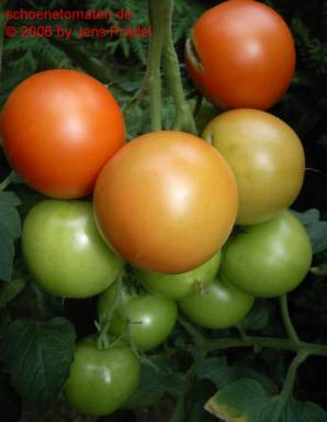 große (ø 5 cm und 60 bis 90 g), runde bis breitrunde, orangerote bis rote Früchte mit extrem glatter Schale, teilweise grünschultrig