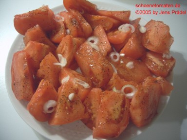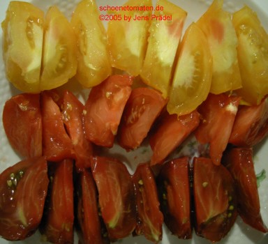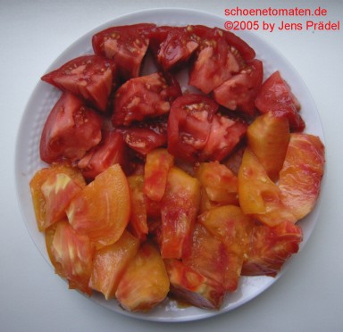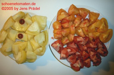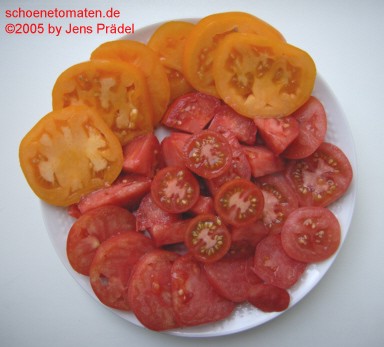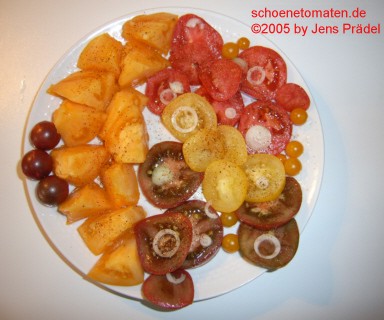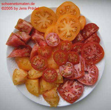 Großer Teller: Beuteltomate aus El Salvador, Santiam, Apollo, Stupicke, Schmatzefein