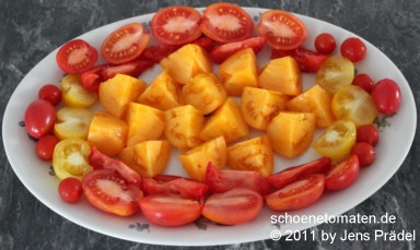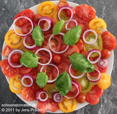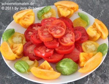 Zolotaja Rybka, Plumpton King, Gold Canary, Calabacito Rojo, Supersweet 100 und Scotland Yellow mit Basilikum und roten Zwiebelringen verziert