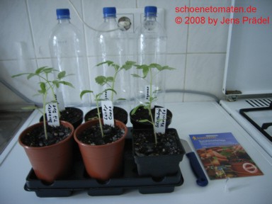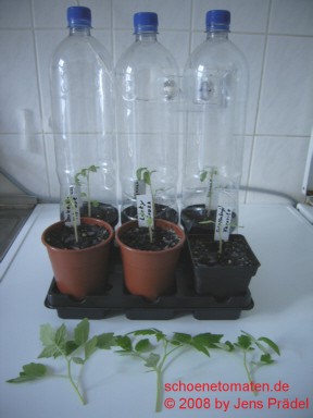 3 fertig veredelte Pflanzen durch abgeschnittene Kunststoffflaschen geschützt (Mikroklima).